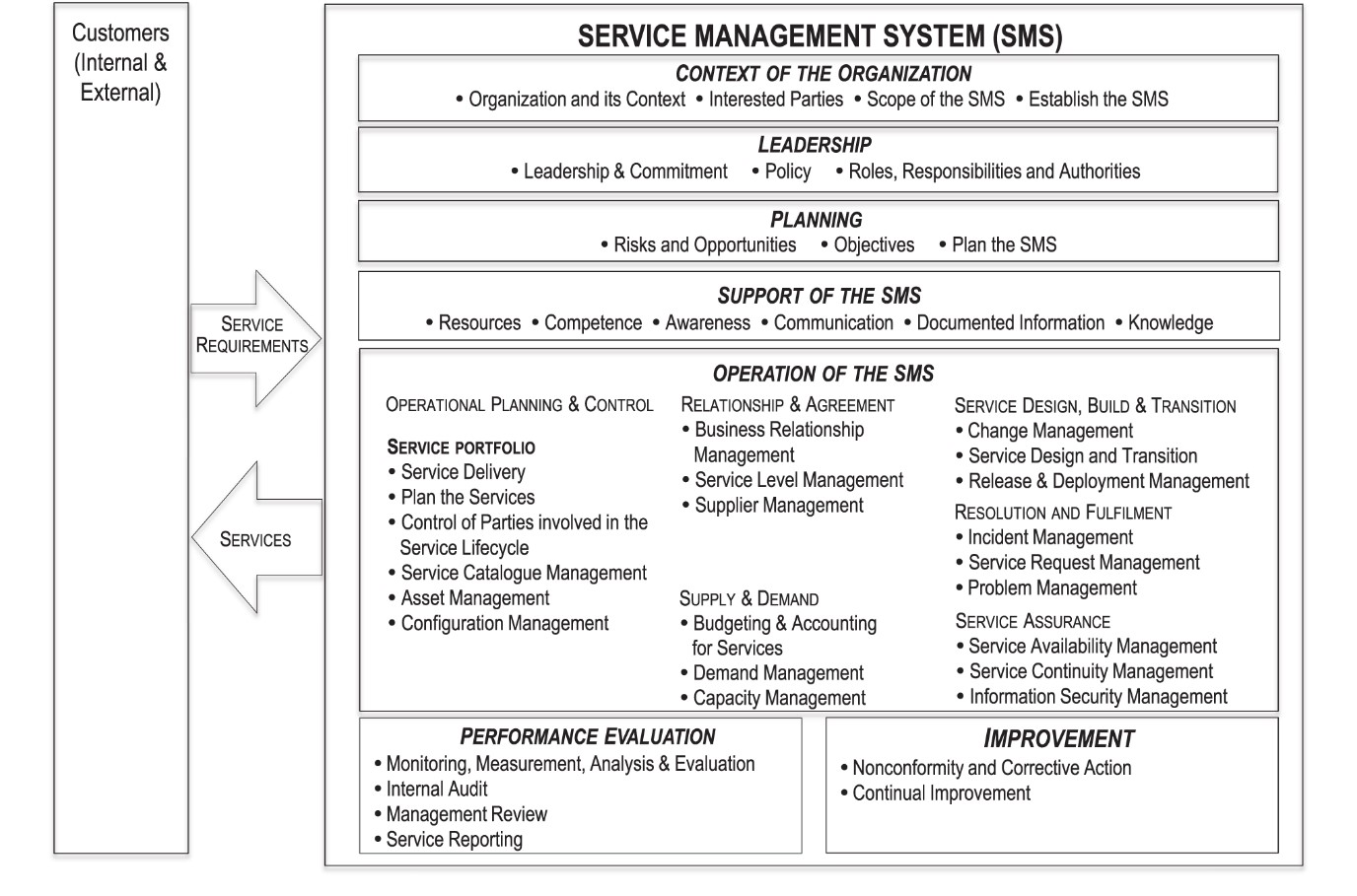 Figure 1 illustrates an SMS with the clause content of ISO/IEC 20000-1. It does not represent a structural hierarchy, sequence, or authority levels.